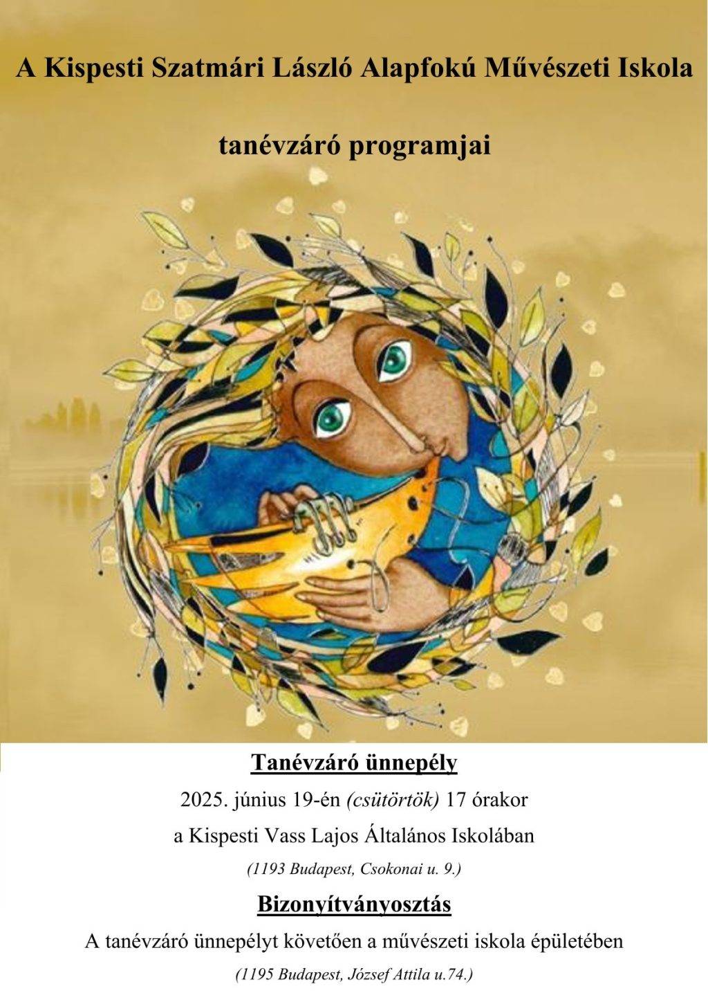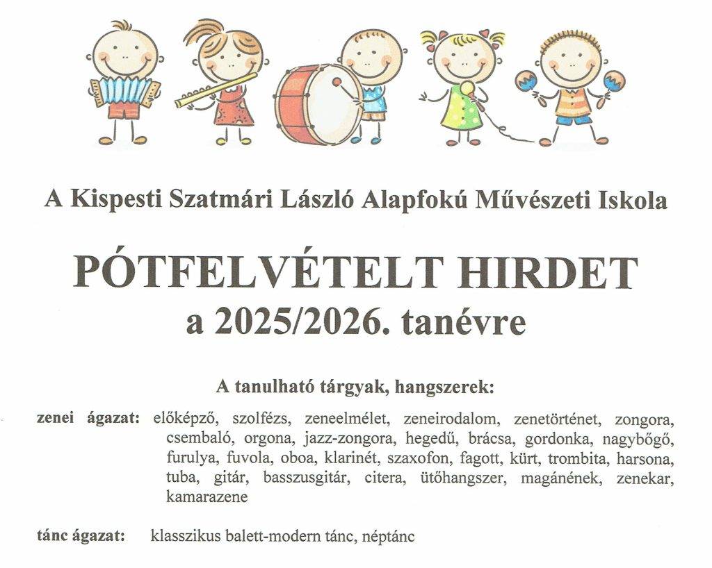 Tisztelt Szülők, Kedves Gyerekek! A művészeti iskolai jelentkezésre online regisztrációs lap kitöltésével van lehetőség. A regisztrált jelentkezőket megkeressük a megadott elérhetőségükön és előre egyeztetett időpontban fogadjuk iskolánkban. A regisztrációs lap az alábbi linkre kattintva tölthető ki: https://forms.gle/nidAJrd5JSB43mf19 A pótfelvételi meghallgatás, a képességek felmérésének, továbbá az eddigi előképzősök hangszerválasztásának ideje: 2025. szeptember 1. (hétfő) helye: Kispesti Szatmári László…