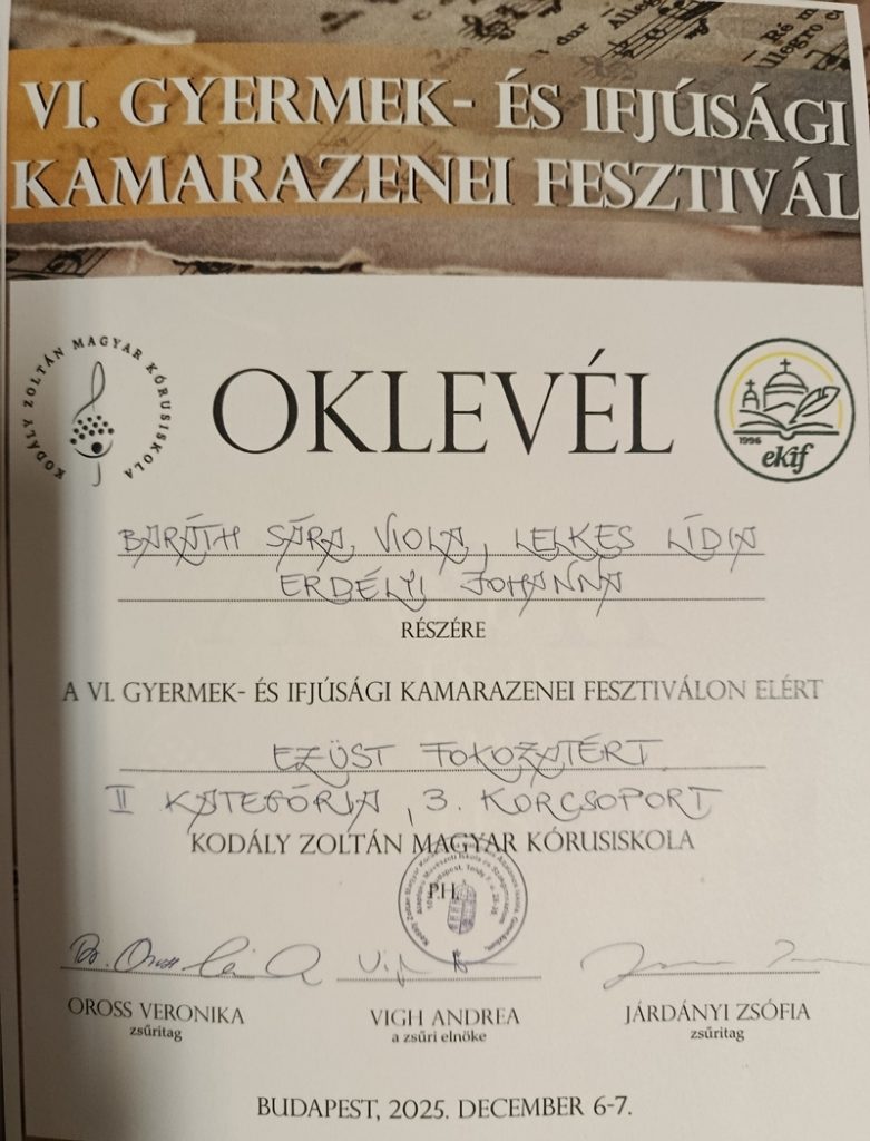 2025. december 6-án és 7-én rendezték a VI. Gyermek- és Ifjúsági Kamarazenei Fesztivált a Kodály Zoltán Magyar Kórusiskola Katolikus Általános Iskola, Gimnázium, Alapfokú Művészeti Iskola és Szakgimnáziumban. A Kispesti Szatmári László Alapfokú Művészeti Iskolát Baráth Sára, Lelkes Lídia és Erdélyi Johanna képviselte a fesztiválon, akiket Seeman Anna, Ötvös Gábor és Szimicsevics Judit készített fel az alkalomra. Növendékeink előadását a zsűri ezüst minősítéssel értékelte.